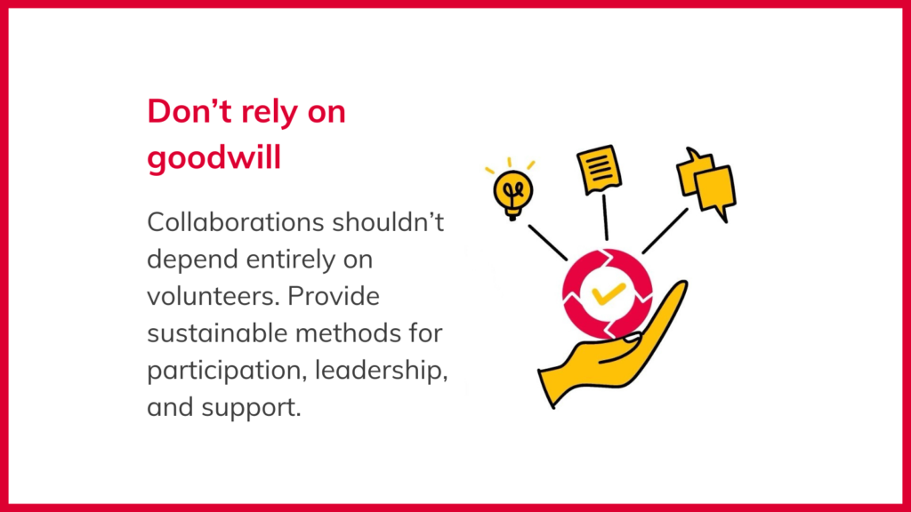 2. Don’t rely on goodwill: Collaborations shouldn’t depend entirely on volunteers. Provide sustainable methods for participation.