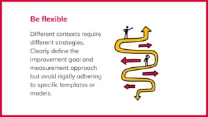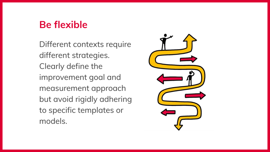 3. Be flexible: Different contexts require different strategies. Clearly define the improvement goal and measurement approach but avoid rigidly adhering to specific templates or models.