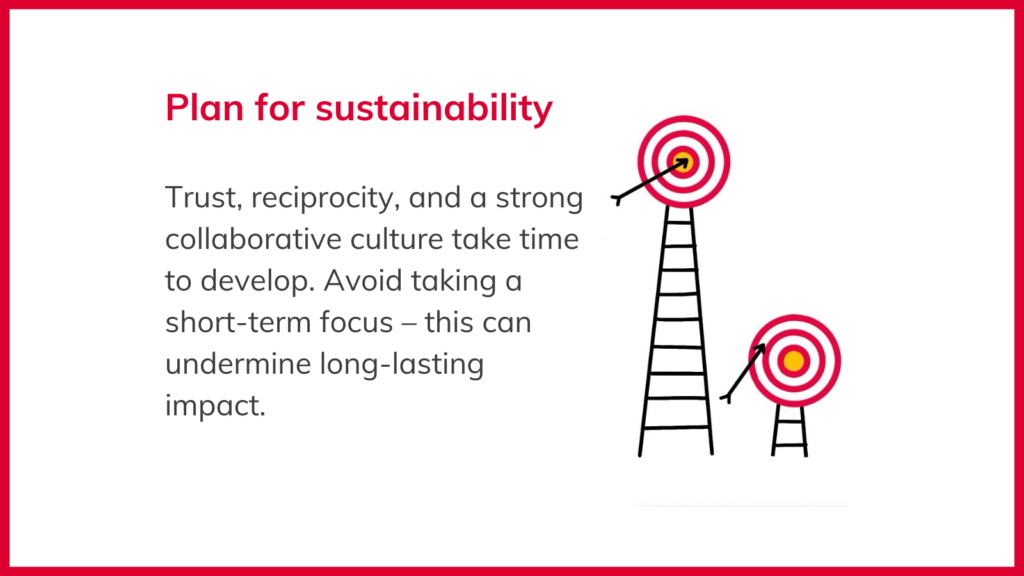 4. Plan for sustainability: Trust, reciprocity, and a strong collaborative culture take time to develop. Avoid taking a short-term focus – this can undermine long-lasting impact.
