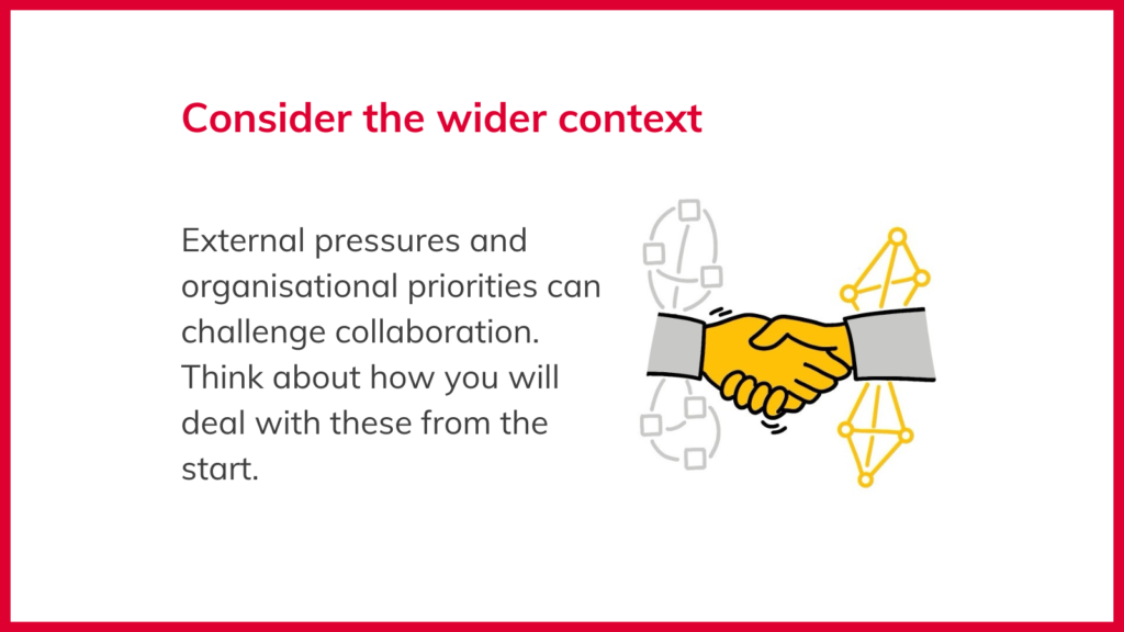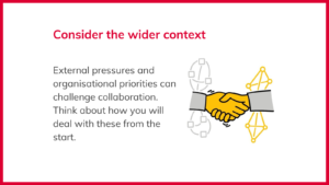 5. Consider the wider context: External pressures and organisational priorities can challenge collaboration. Think about how you will deal with these from the start.