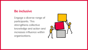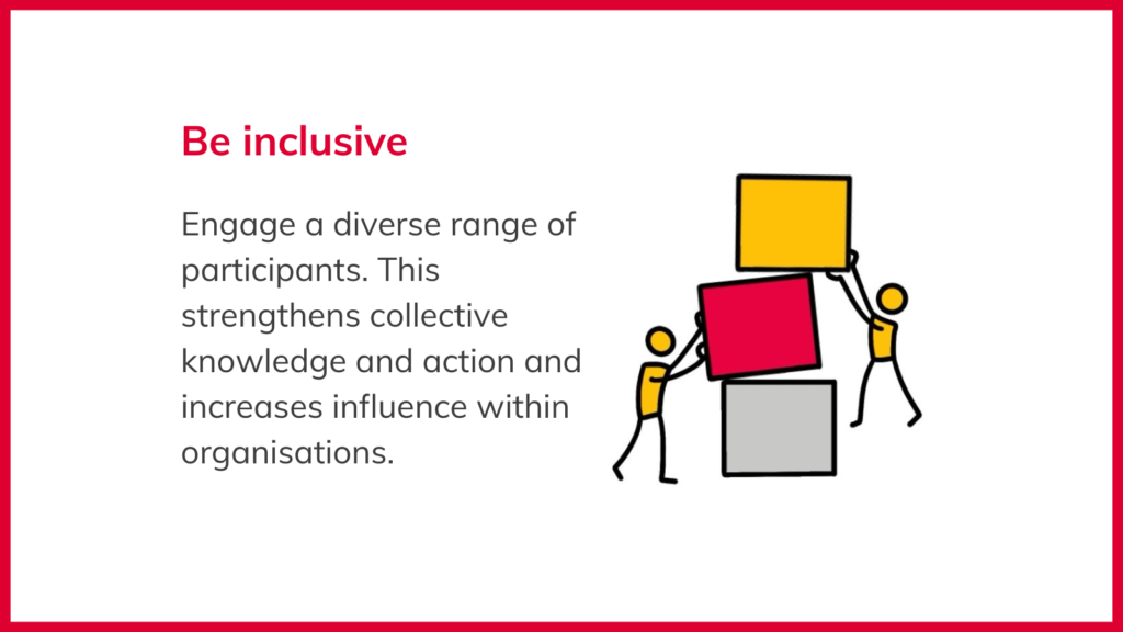 6. Be inclusive: Engage a diverse range of participants. This strengthens collective knowledge and action and increases influence within organisations.