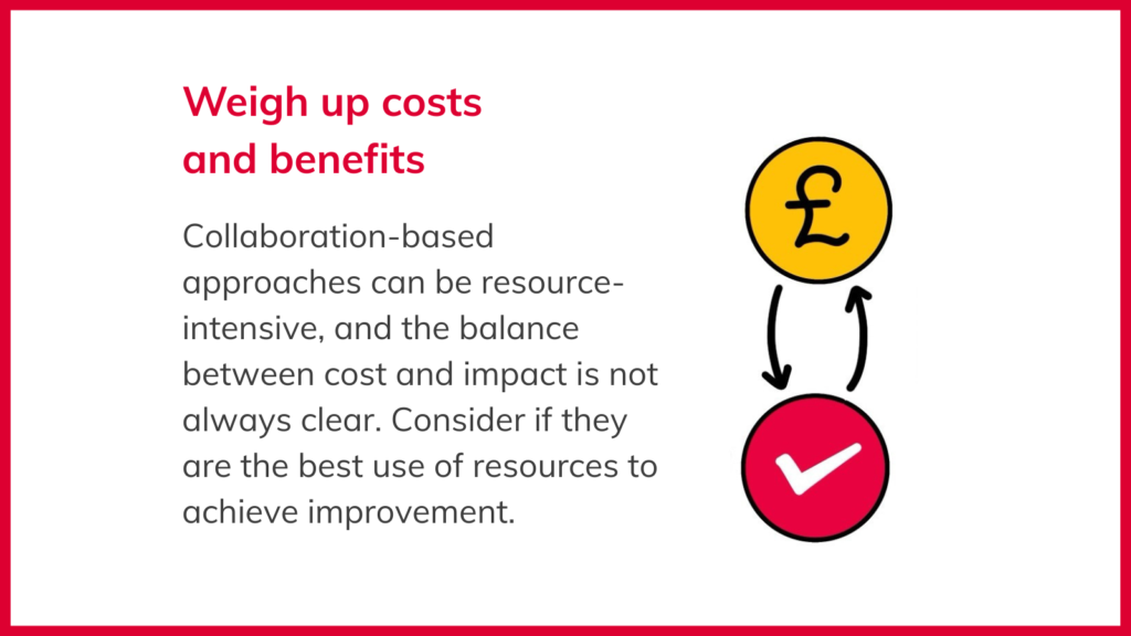 8. Weigh up costs and benefits: Collaboration-based approaches can be resource-intensive, and the balance between cost and impact is not always clear. Consider if they are the best use of resources to achieve improvement.
